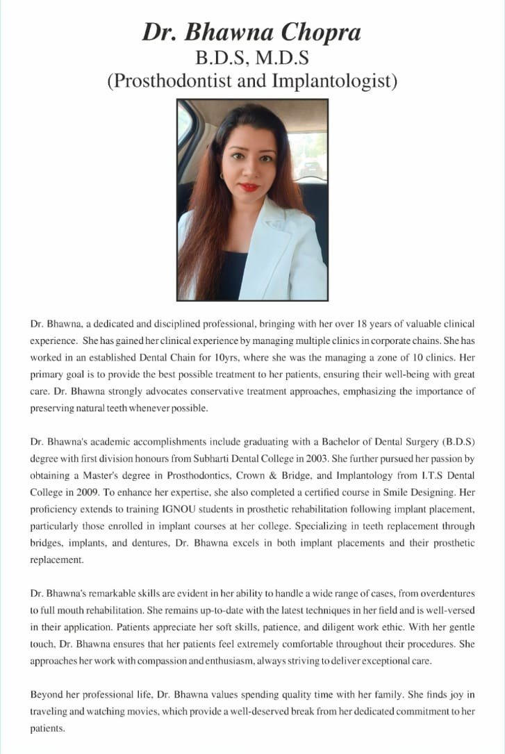 With over 18 years of clinical excellence, Dr. Bhawna Chopra is a highly skilled and compassionate dental specialist dedicated to restoring confident smiles. She holds a Bachelor of Dental Surgery from Subharti Dental College (2003) and a Master’s in Prosthodontics, Crown & Bridge, and Implantology from I.T.S Dental College (2009).