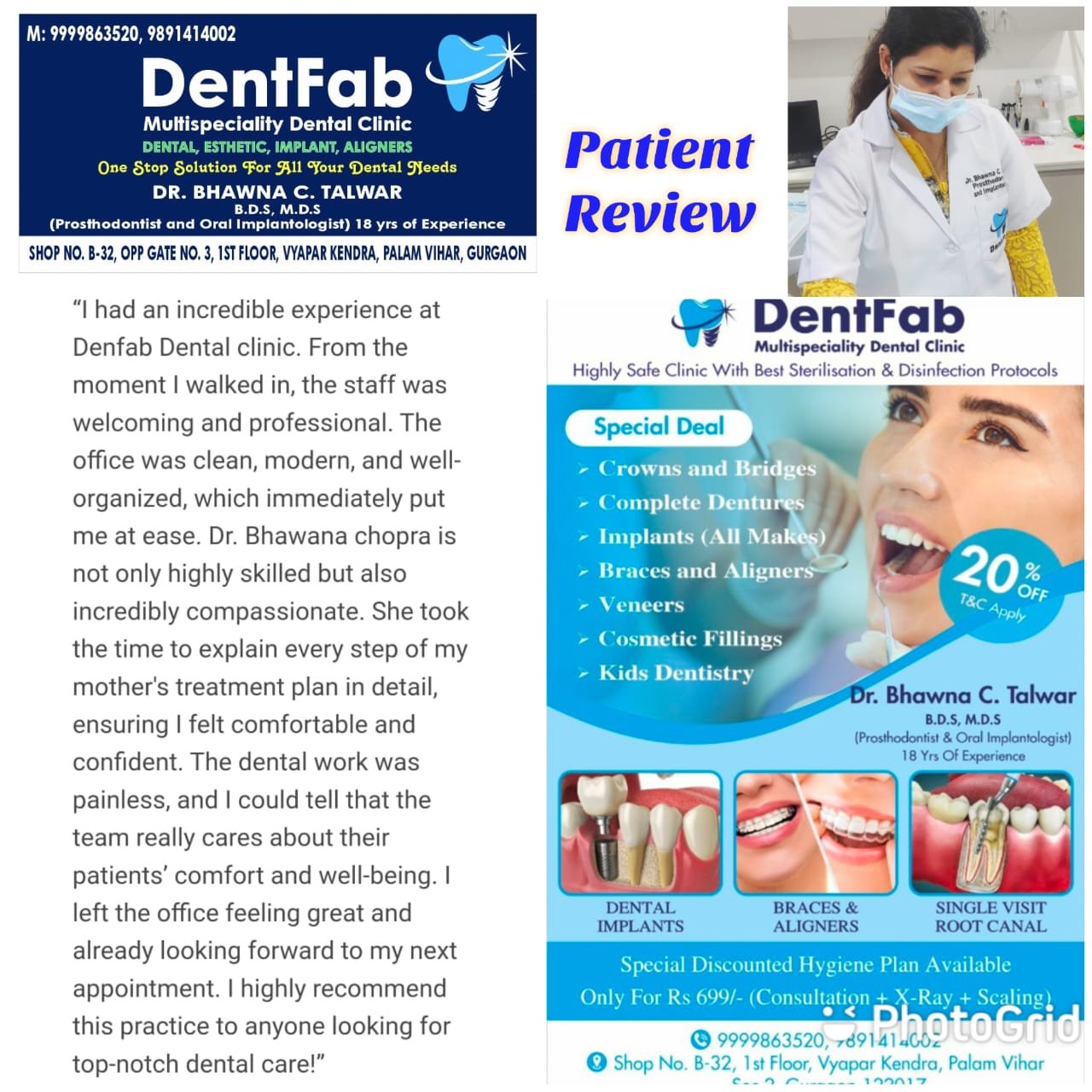 Rajiv TalwarTrustindex verifies that the original source of the review is Google. Real comfortable, successful and painless dental implant. Best wishes and blessings. Chanda AmarjitTrustindex verifies that the original source of the review is Google. I highly recommend Dr Bhawna C Talwar of Dentfab Multi-speciality Dental Clinic Palam Vihar, I use to be nervous about visiting the dentist, but choosing them was one of the best decisions I have made, Dr Bhawna explains every step of the treatment process and makes you feel completely at ease . My overall experience was truly amazing, I m very greatful to Dr Bhawna C Talwar, She has been super helpful and supportive throughout my entire treatment. Vacky KumarTrustindex verifies that the original source of the review is Google. Dr Bhawna is truly one of the best dentist out there in Palam Vihar , She works with exceptional patience and dedication, I absolutely love her work , Her clinic is v beautiful,cozy and peaceful and her team is extremely well trained and kind . Dr Bhawna goes above and beyond to ensure healing is complete, The whole setup has been currated with thought and maturity of an experienced professional.Best wishes to her Sunita ChuchraTrustindex verifies that the original source of the review is Google. Best Dentist in town Dr Bhawna has a Amazing hand and Highly skilled Dentist, Highly Recommend to all looking for Quality dental work KrishnaaratiTrustindex verifies that the original source of the review is Google. I have been visiting dr Talwar for 4 years now, got all 4 of my wisdom tooth removed from them. My best and most favourite doctors! Vandana SemwalTrustindex verifies that the original source of the review is Google. Good clinic with excellent service. Dent Fab Clinic is a very good clinic. Dr. Bhawna treated my tooth very carefully, and the treatment was completely painless. She was very polite, kind, and professional. I am really satisfied with the treatment and overall experience. Highly recommended.